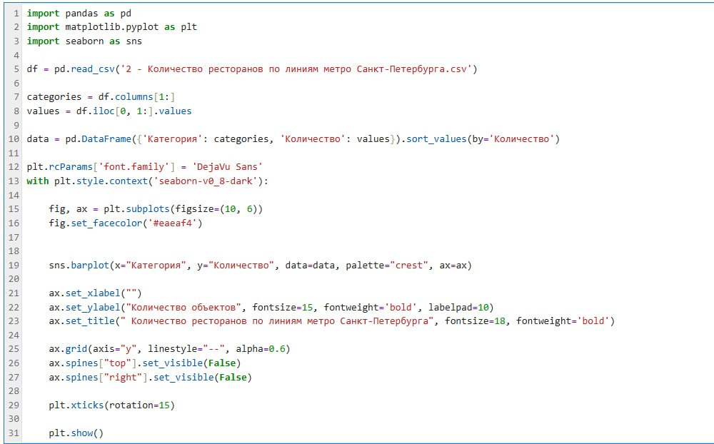 Далее нужно понять, до каких ресторанов можно добраться на метро. В таком большом городе легко потеряться или зайти не туда, поэтому важно, чтобы была возможность добраться до нужного места. Была использована столбчатая диаграмма для наглядности.