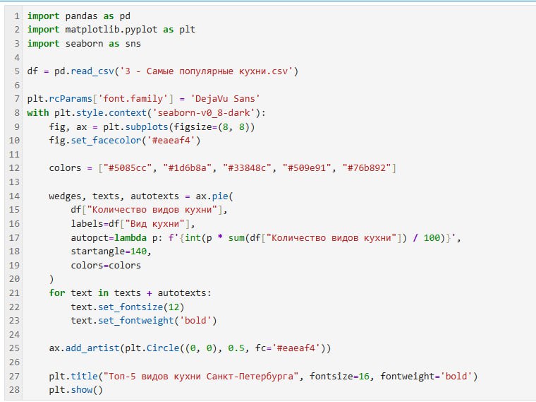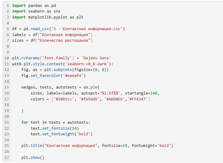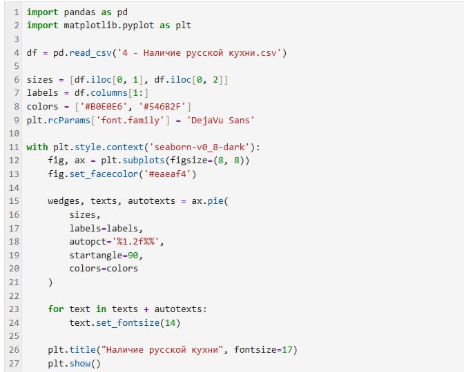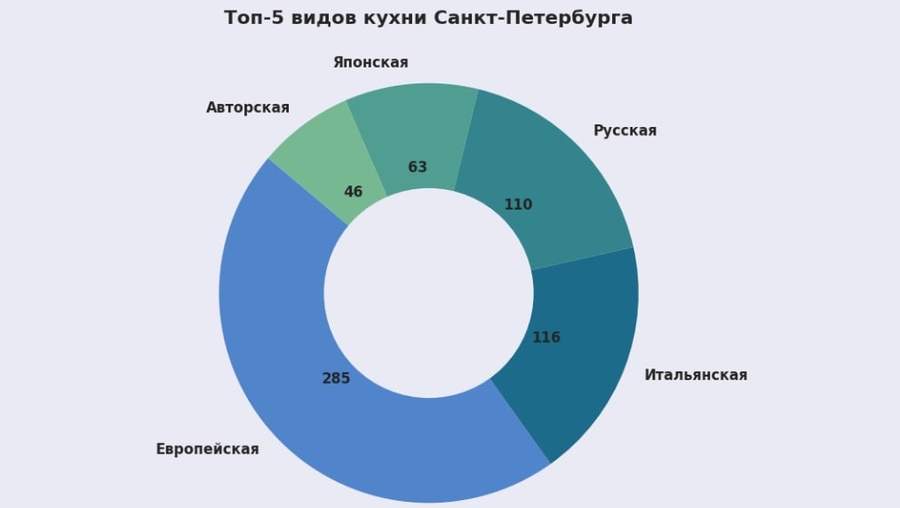 Очень важно, чтобы в ресторане была русская кухня, чтобы максимально окунуться в петербургскую атмосферу. С помощью круговой диаграммы можно увидеть процент ресторанов с ее наличием.