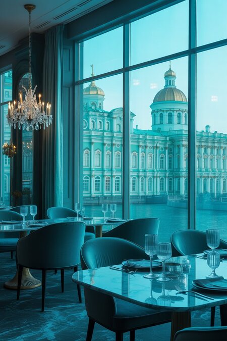 Обложка: Generate a cover for a presentation on the topic of restaurant analysis in St. Petersburg in turquoise tones with no text. 1. Generate an image for a presentation on restaurant in St. Petersburg in turquoise tones. 2. Generate an image for a presentation on restaurant in St. Petersburg in turquoise tones. 3. Generate an image for a presentation on restaurant analysis in St. Petersburg in turquoise tones.