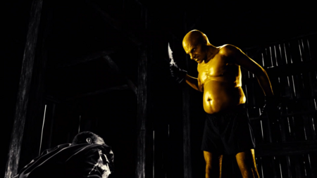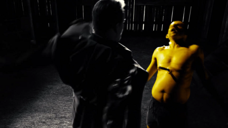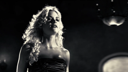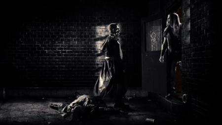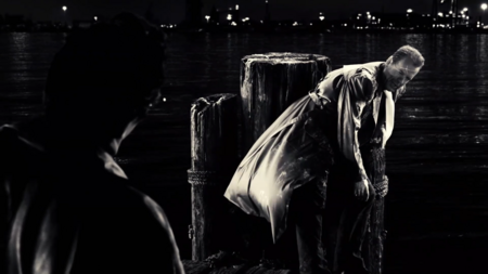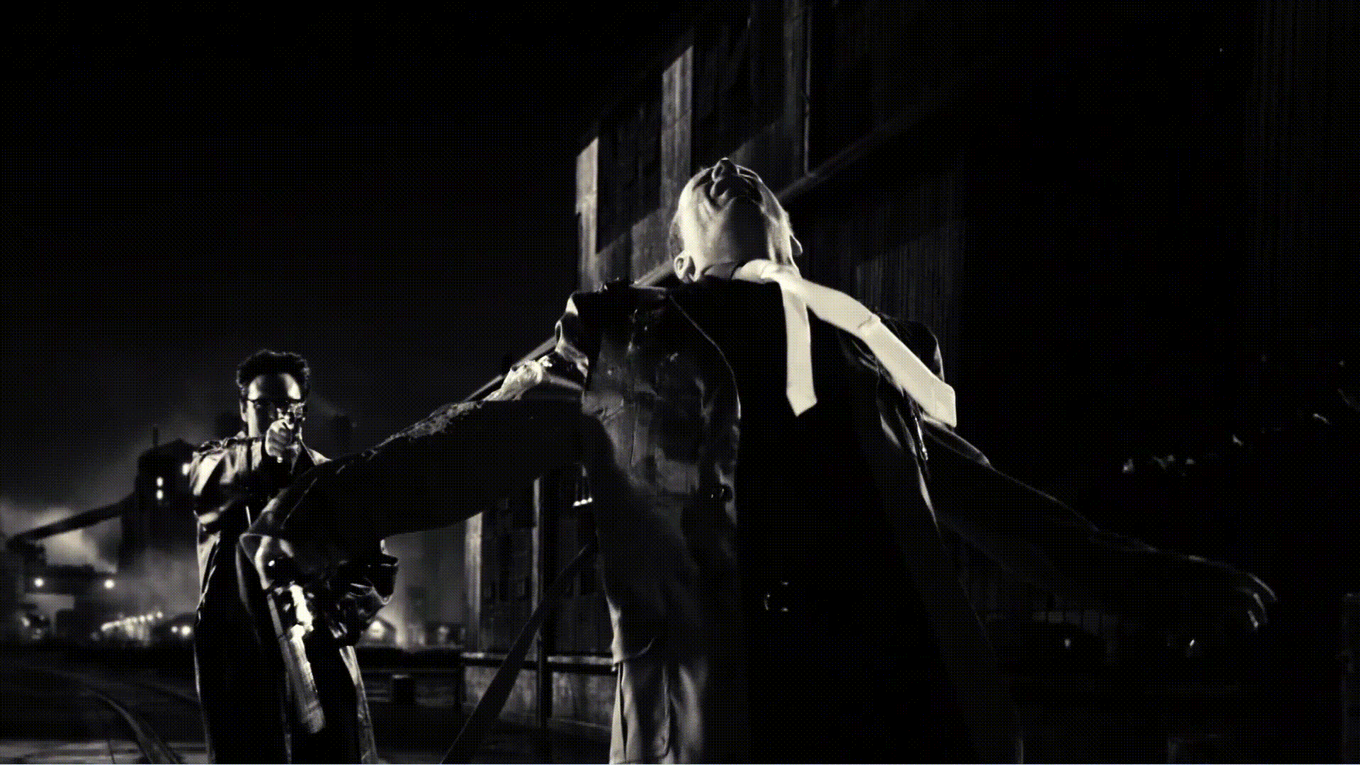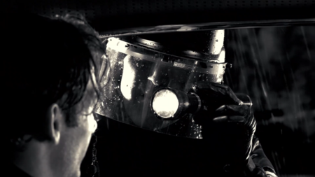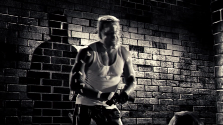 Тени в принципе играют большую роль в «Городе грехов»: показывая опасность, вызывая дискомфорт, загоняя в рамки. Хартиган хоть и нападает из засады, композиция дана прямой, без заваливающихся углов и диагоналей. Лишь масштаб силуэта показывает, кто победит, а кто проиграет. Кадр со злодеями, напротив, дан под острым углом, тени окружили Нэнси, оставив лишь небольшой просвет белого. Такая композиция уже вызывает чувство беспокойства и интриги. Характерно, что в фильме тени отбрасывают не только злодеи, но и герои, тем самым размывая рамки хорошего и плохого, идя по пути серой морали.
