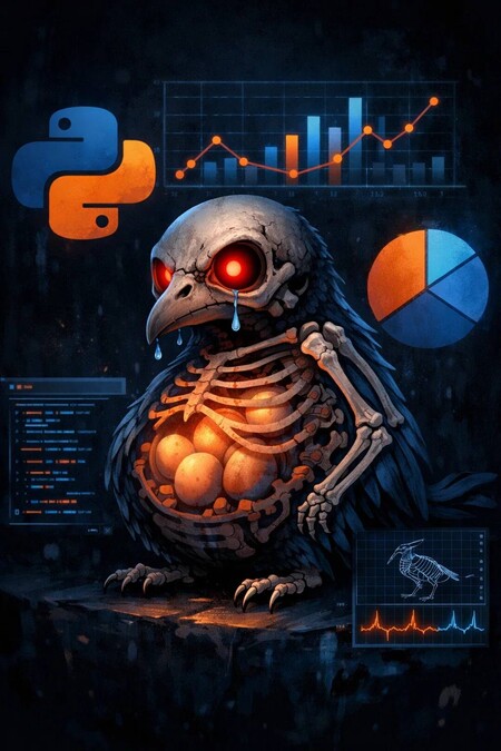 промпт: создай изображение костей птиц киборгов с элементами python — графики и диаграммы. птицы должны кричать на зрителя и быть мускулистыми с короткими лапами