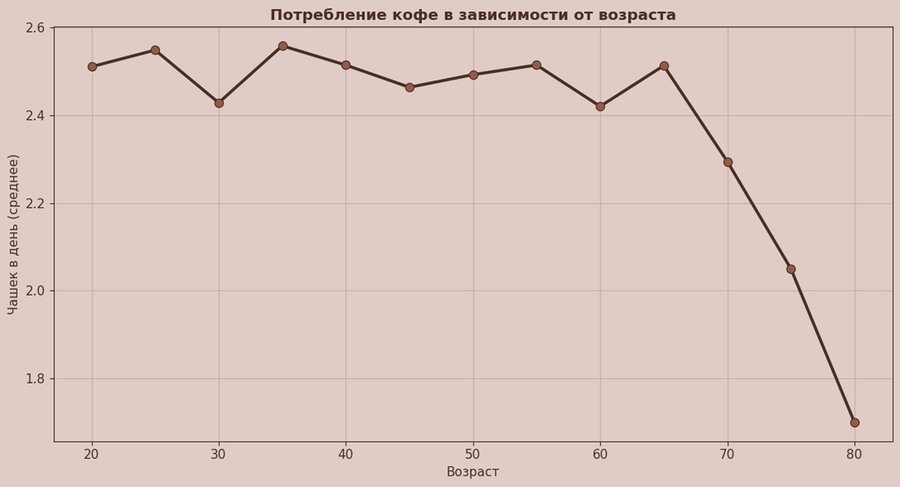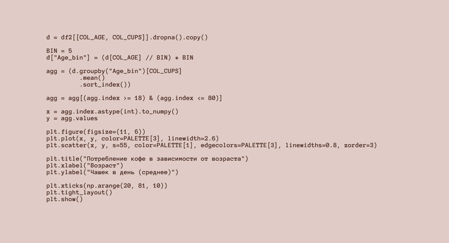 Этот график отвечает на самый базовый вопрос: как меняется среднее потребление кофе с возрастом. Я сгруппировала возраст по шагу 5 лет и посчитала среднее число чашек в день для каждого интервала. Вместо столбцов я использовала линию с маркерами, чтобы график читался как плавная зависимость, а точки подчёркивали, что кривая построена по реальным агрегированным значениям.