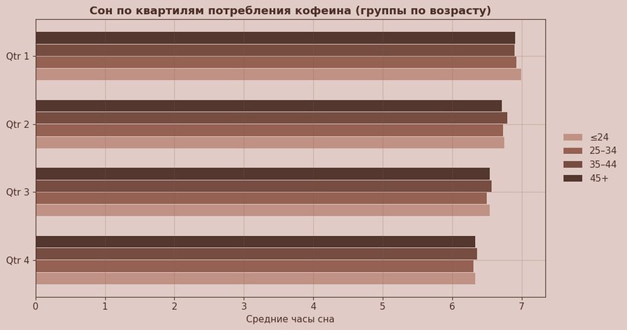 Здесь я перехожу от «кто сколько пьёт» к вопросу как кофеин соотносится со сном. Я разделила значение Caffeine_mg на 4 квантили (Qtr 1–Qtr 4) и посчитала средние часы сна внутри каждой квантильной группы. Дополнительно я выделила возрастные категории (≤24, 25–34, 35–44, 45+), чтобы увидеть, одинаково ли работает связь «кофеин — сон» в разных возрастах.