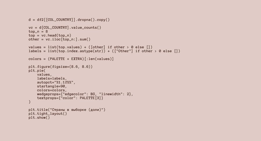 Круговую диаграмму я использовала как обзорный снимок: из каких стран состоит выборка. Я взяла топ-8 стран по числу наблюдений и объединила остальные в категорию Other, чтобы график не превращался в перегруженную легенду. Такой формат помогает сразу увидеть, какие страны задают основной вес данных и на что стоит обращать внимание при интерпретации результатов.
