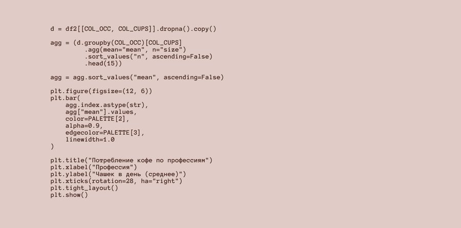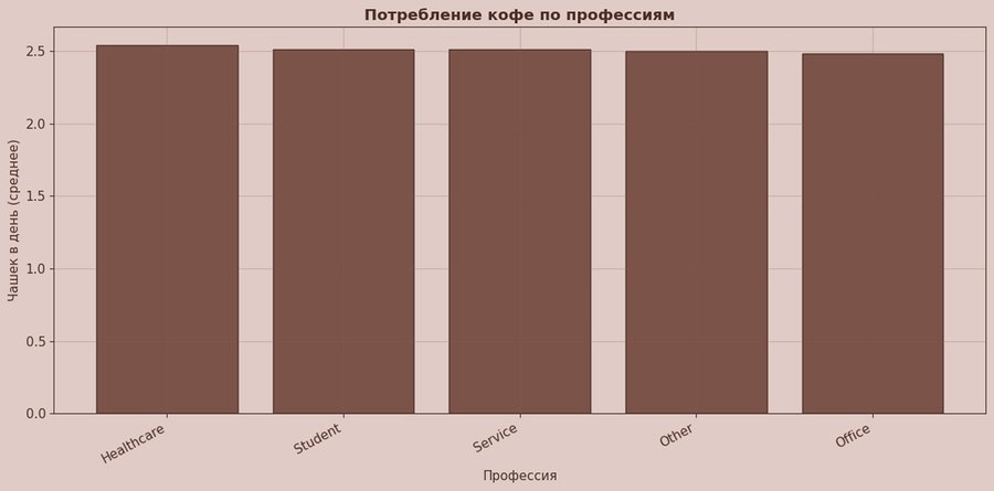 Этот график отвечает на вопрос кто пьёт больше по профессиональному контексту. Я сгруппировала данные по профессиям и посчитала среднее число чашек в день, оставив топ-15 профессий по числу наблюдений (чтобы сравнение было корректным и читаемым). Затем я отсортировала профессии по среднему значению — так график читается как рейтинг.
