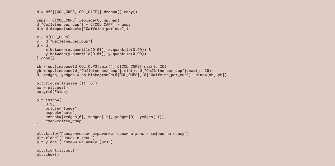 Прямого поля «зачем пьют кофе» в датасете нет, поэтому я сделала поведенческий прокси: X = чашки в день, Y = кофеин на чашку (Caffeine_per_cup). Тепловая карта показывает, где в данных находится основная концентрация наблюдений, то есть какие режимы потребления встречаются чаще. Перед построением я ограничила экстремальные значения по квантилям (1% и 99%), чтобы редкие выбросы не сломали масштаб и не сделали картинку нечитаемой.