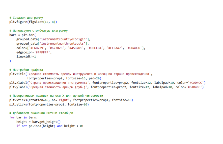 Страна происхождения является важным фактором ценообразования в прокате музыкальных инструментов. Для контраста разницы в стоимости я вновь обратилась к столбчатой диаграмме, которая визуально демонстрирует разницу цены относительно страны производства.