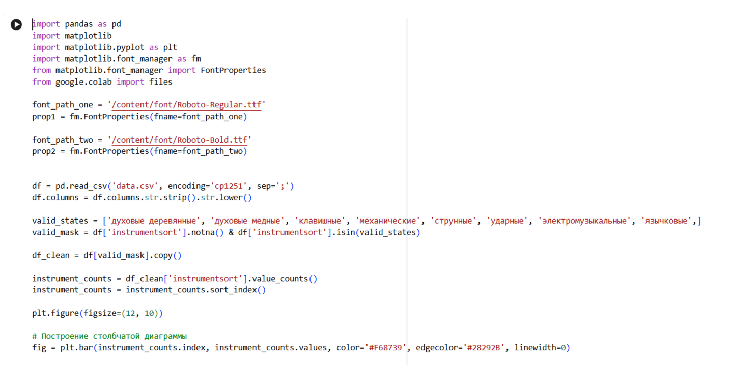 При работе с большим объемом данных, первым делом я решила распределить количество музыкальных инструментов по видам, чтобы упорядочить информацию и разделить категории.