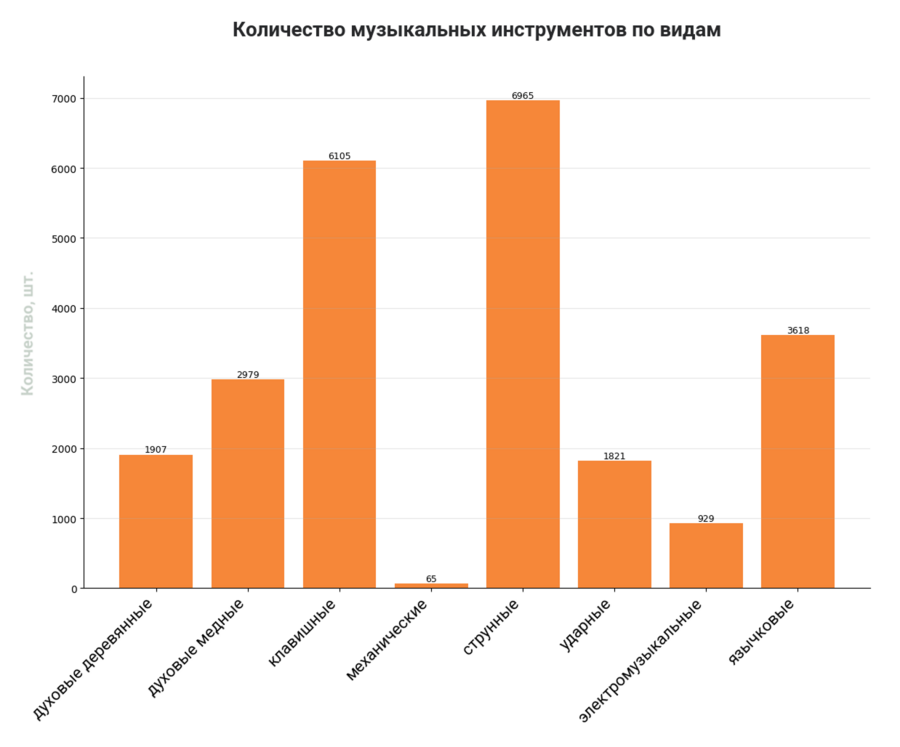 Мы видим, что наиболее многочисленной категорией являются струнные инструменты — их более 6 900 штук. На втором месте — ударные инструменты (почти 3 700 штук), а на третьем — клавишные (около 3 000). Наименее распространенная категория музыкальных инструментов — механические (по всей Москве всего 65 штук).