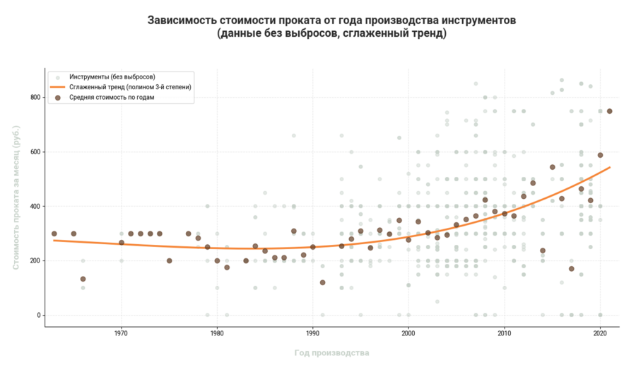 Что касается стоимости аренды (а от этого зависит положение в музыкально-образовательных учреждениях), то было решено построить диаграмму рассеяния с линией тренда, чтобы нагляднее проследить влияние года производства на стоимость проката инструментов.