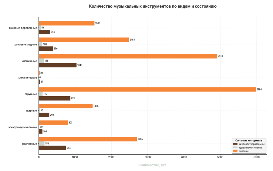 Круговая диаграмма показывает распределение музыкальных инструментов по состоянию. Данный тип диаграммы нагляднее всего демонстрирует ситуацию. Мы видим, что подавляющее большинство инструментов — 81,8% находится в хорошем состоянии (почти 20 000 штук). Неудовлетворительное состояние имеют 15,6% инструментов (около 3 800 штук), а удовлетворительное — всего 2,6% (около 650 штук)