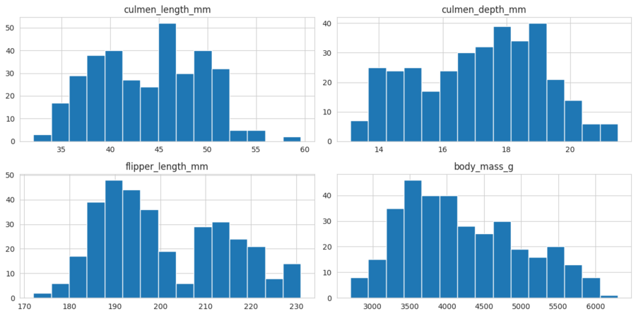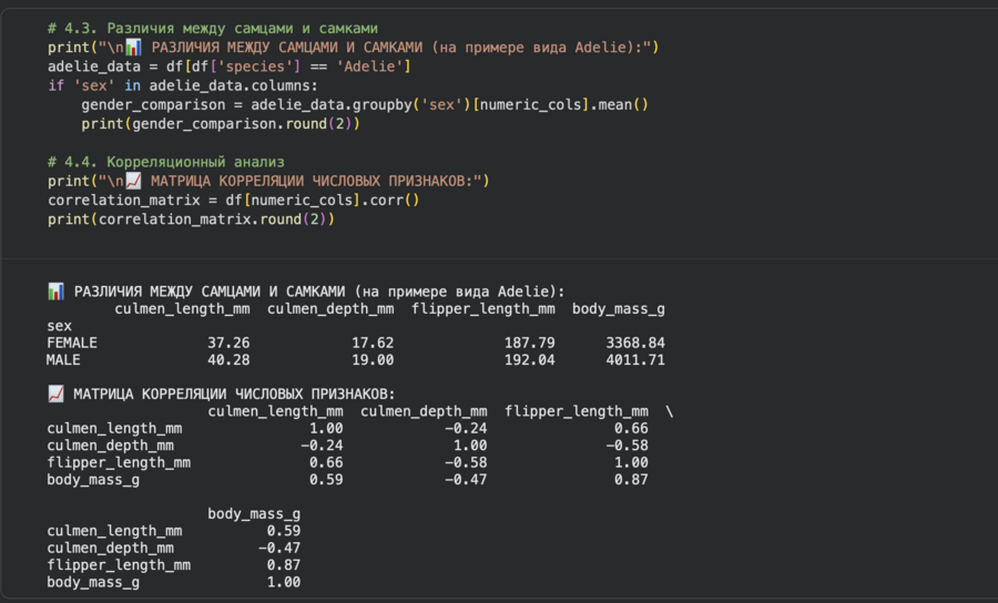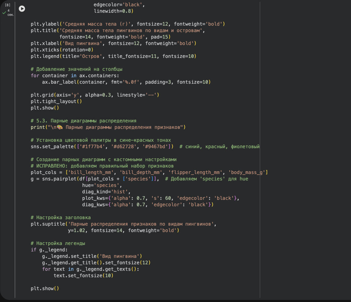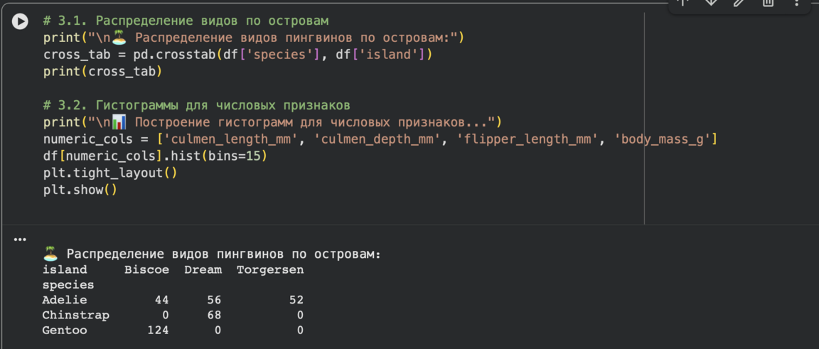 Сначала был написан код для таблицы сопряжённости для анализа распределения видов по островам Гистограммы для каждого числового признака для оценки формы распределений, был предложен чатом для детализации анализа