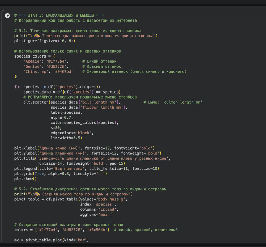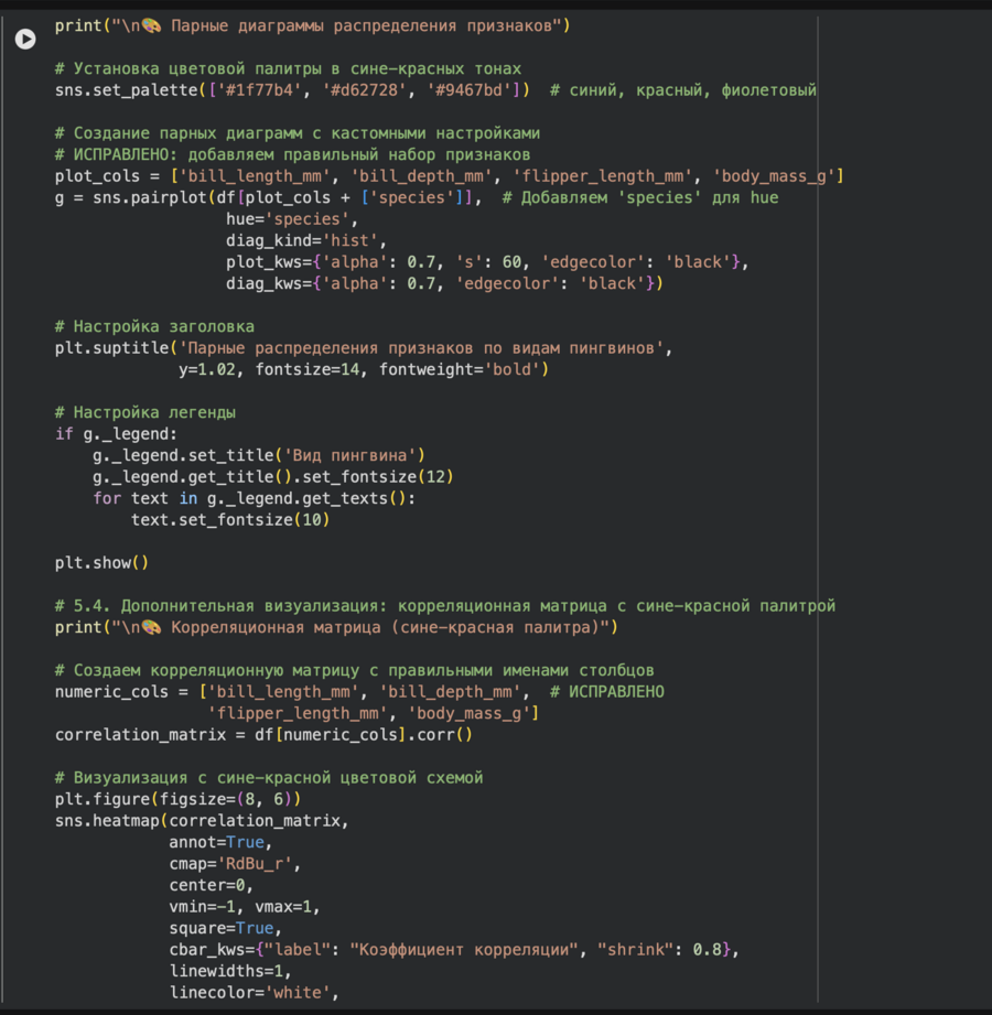 Анализ и визуализация выполнялись с помощью языка Python в среде Google Colab. Для обработки и расчётов применялась библиотека Pandas, которая идеально подходит для работы с табличными данными: с её помощью легко проводить фильтрацию, группировку и вычисление статистик. Создание графиков было реализовано с использованием связки библиотек Matplotlib и Seaborn. Seaborn был особенно полезен, так как он позволяет строить сложные статистические графики (например, парные диаграммы распределения или тепловые карты корреляций) всего несколькими строками кода, обеспечивая при этом профессиональный внешний вид.