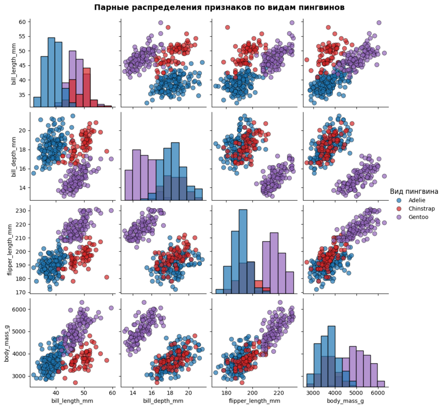 Для исследования был выбран датасет Penguin Sizes Dataset с платформы Kaggle. Этот набор данных содержит информацию о 344 особях пингвинов трех видов: Адели (Adelie), Антарктических (Gentoo) и Папуа (Chinstrap), обитающих на трех островах архипелага Палмера в Антарктике. Данные включают морфометрические измерения: длину и глубину клюва, длину плавника, массу тела, а также информацию о виде, острове обитания и поле каждой особи.