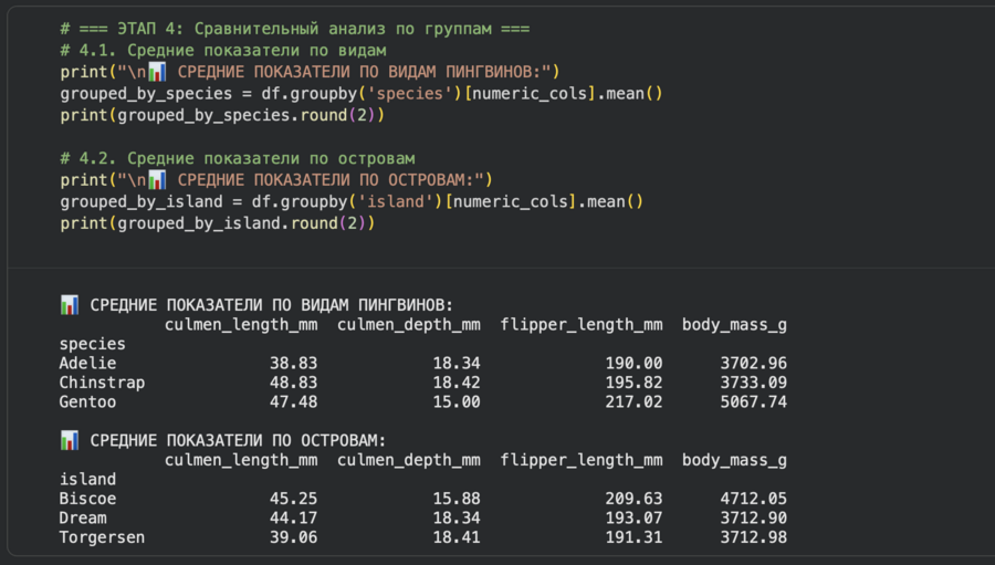 После того, как данные были очищены и изучены их общие распределения, мы перешли к самому интересному — сравнительному анализу. Целью было понять, как физические характеристики пингвинов различаются в зависимости от их вида, пола и места обитания. По сути, мы хотели найти ответы на вопросы: «Кто из пингвинов самый крупный?», «Влияет ли остров на их размер?» и «Сильно ли отличаются самцы от самок?».