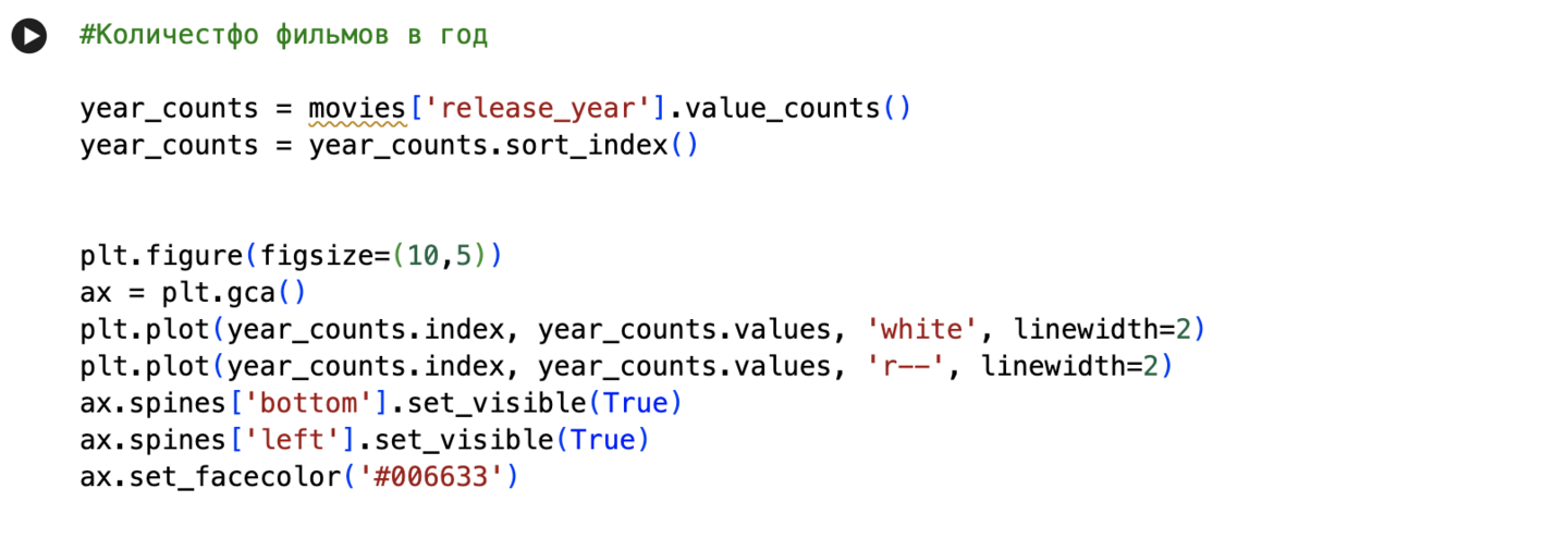 Больше всего фильмов вышло 2020 году. На графике видно, что их число превышает значение в 80 катрин. При помощи функции len () узнаем их точное количество
