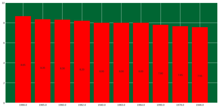 На первый взгляд выглядит достаточно оптимистично, но стоит вспомнить первый график, становится понятно, что этот топ не совсем корректен, поскольку в некоторые года выпускался всего один фильм. Всего один, зато удачный.