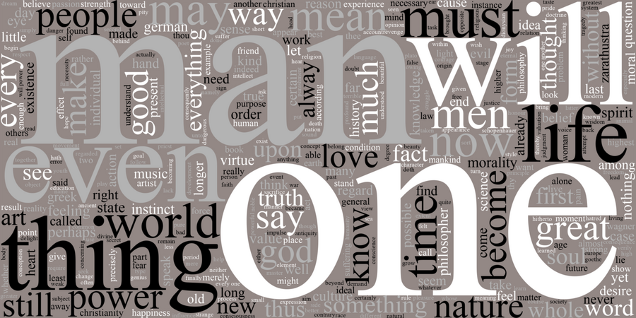 Наиболее крупные слова — man, life, world, truth, power, god, will — указывают на преобладание абстрактных философских категорий, связанных с человеком, жизнью и ценностями. Важным является то, что в облаке почти отсутствуют конкретные предметные обозначения. Можно сказать, что язык Ницше ориентирован не на описание эмпирической реальности, а на концептуальное осмысление фундаментальных оснований бытия. Частотное присутствие слова god в окружении понятий truth и power подчёркивает критический характер его размышлений о религии и метафизике, тогда как доминирование слов, связанных с человеком и жизнью, фиксирует антропоцентрическую направленность философии Ницше.