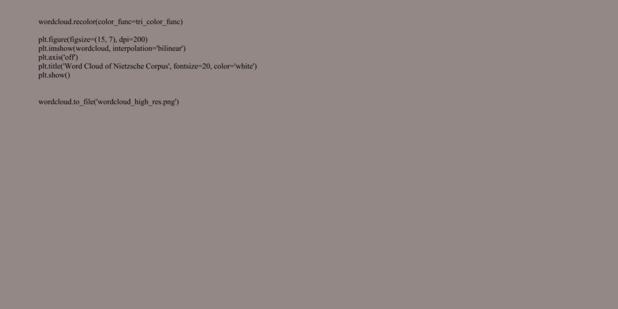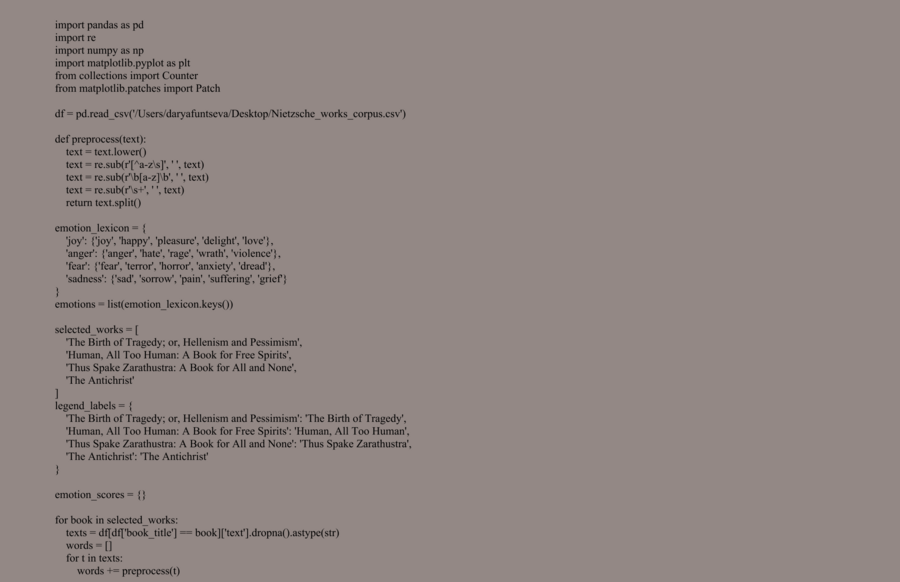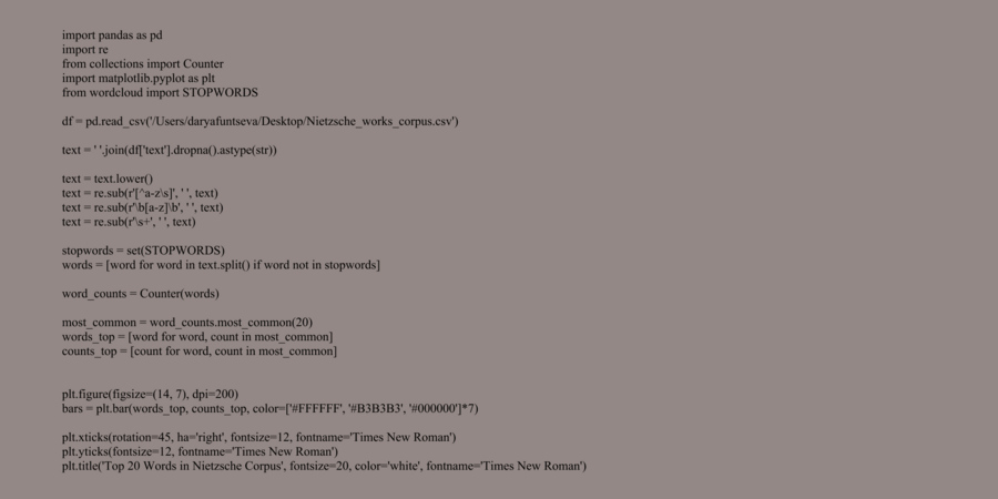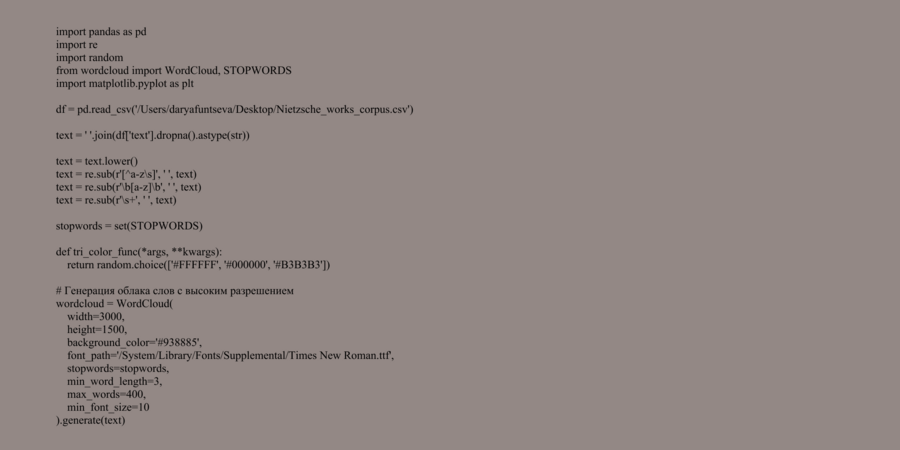 В ходе проекта был проведен анализ произведений Фридриха Ницше с использованием методов визуализации данных, что позволило взглянуть на философские тексты вне обычных рамок интерпретации, выявить количественные закономерности в языке и тематике, а также сравнить произведения на основе формальных характеристик. Таким образом, анализ данных служит не только техническим инструментом, но и философским жестом, созвучным самому Ницше — попыткой выйти «за пределы» традиционных интерпретаций и приблизиться к иной форме понимания текста.