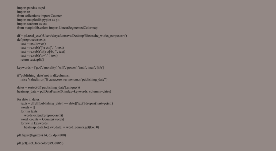 Тепловая карта визуализирует динамику использования ключевых философских понятий в зависимости от даты публикации произведений Ницше и позволяет рассматривать его философию в развитии.