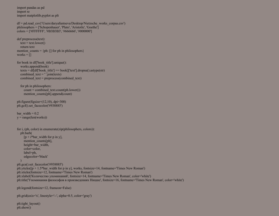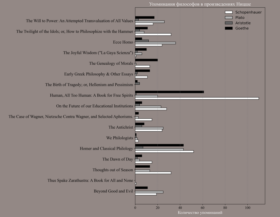Выбор философов для графиков обусловлен личным интересом. Так как было интересно просмотреть динамику между авторами, которых Ницше не редко упоминает и отсылает к ним. По оси Y представлены названия произведений, а по оси X — число упоминаний, что позволяет одновременно анализировать как отдельные тексты, так и общую структуру философских отсылок. Особенно примечательно доминирование упоминаний Шопенгауэра в ряде работ, прежде всего в 'Human, All Too Human', что подтверждает значимость этого философа как ключевой фигуры влияния и одновременно объекта критического переосмысления для Ницше. Упоминания Платона и Аристотеля распределены более равномерно и в меньших количествах, что может указывать на их роль как представителей классической философской традиции, с которой Ницше вступает в диалог. Наличие Гёте в корпусе подчёркивает не только философские, но и культурно-литературные ориентиры Ницше.