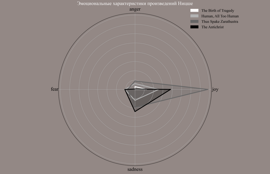 Каждое произведение представлено отдельным контуром, что позволяет визуально сопоставить их эмоциональные профили. Примечательно, что разные тексты демонстрируют существенно отличающиеся структуры: например, 'Thus Spake Zarathustra' выделяется высокой долей лексики, связанной с радостью, что может быть интерпретировано как выражение утвердительного, жизнеутверждающего пафоса, в то время как 'The Antichrist' показывает более выраженные значения по шкалам гнева и печали, отражая его полемический и критический характер. Радарная диаграмма наглядно демонстрирует, что эмоциональная структура произведений Ницше неоднородна и варьируется в зависимости от жанра, периода и философских задач конкретного текста, тем самым подчёркивая многослойность его философского языка.
