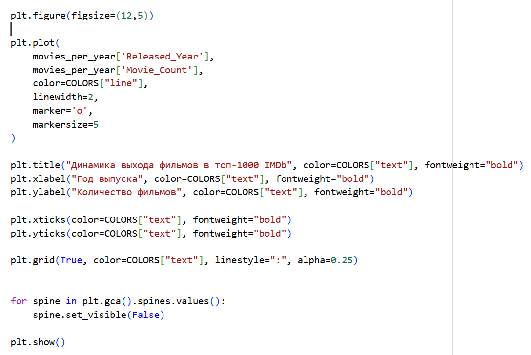 Далее я построила линейный график, где по оси X представлены годы выпуска, а по оси Y — количество фильмов, попавших в топ-1000. Также я настроила цвет линии и маркеров, оформила заголовок и подписи осей, добавив сетку для удобства чтения графика.