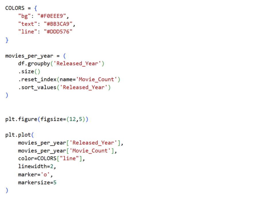 В данной части кода я сгруппировала фильмы по году выпуска и посчитала, сколько фильмов попало в топ-1000 за каждый год.