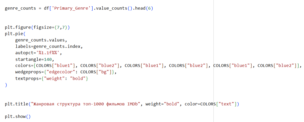 1. Гистограмма — для отображения распределения рейтингов IMDb. 2. Линейный график — для отображения динамики выхода фильмов по годам. 3. Круговая диаграмма — для отображения топ-6 жанров по количеству фильмов. 4. Столбчатая диаграмма — для отображения среднего рейтинга по жанрам.