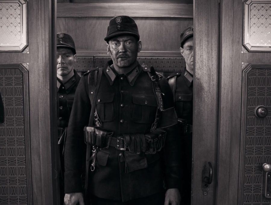 Хотелось бы также отметить серый цвет. В фильме он отражает новые порядки, которые забирают краски из окружающего мира и делают его мрачнее, хуже. Появление серого часто сопровождает моменты подавленности, несвободы в сценах в тюрьме. Он отражает антагонизм в лице полицейских и агрессивную среду тюрьмы. Это противовес безопасности, уюта и порядка, которые царят внутри стен отеля. Однако в отличие от черного цвета, серый оттенки несёт в себе нотки добра. Это очень заметно на примере момента в поезде в первой трети фильма, когда герой Эдварда Нортона помог нашим протагонистам в поезде и заступился за них перед своими подчинёнными. Или в сцене в тюрьме когда один из заключённых, внушавший ужас с первого взгляда, в итоге помог Густаву сбежать убив своего сокамерника, который хотел сдать беглецов. Обе эти сцены отражают то, что проявление доброты может в итоге спасти жизнь, ведь даже в людях, которые на первый взгляд могут показаться очень холодными и опасными, всё еще могут присутствовать положительные качества.