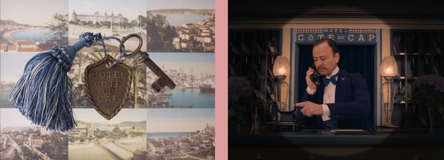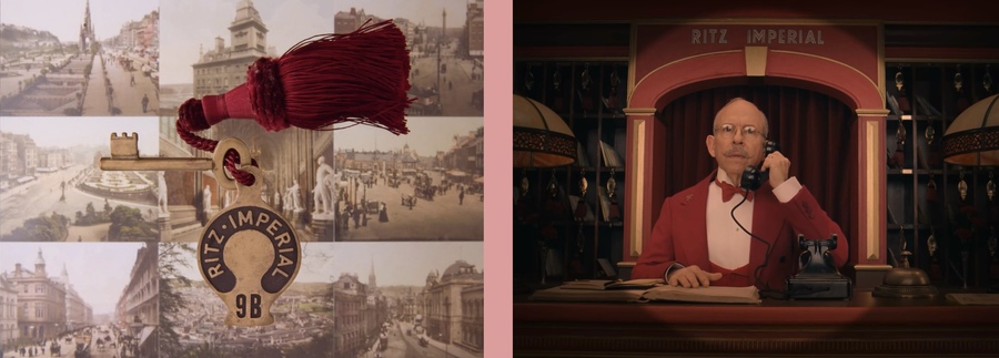 Андерсон часто использует ракурсы, когда камера расположена прямо над объектом для крупных планов-вставок. Кадры сверху подчеркивают искусственную, «кукольную» структуру мира фильма. Все элементы внутри кадра выглядят идеально организованными, словно экспонаты в витрине. Такой ракурс усиливает впечатление искусственности, театрализации и подчёркнутой симметрии эстетики режиссёра — зритель получает максимальный контроль над пространством, в буквальном смысле становится «наблюдателем» за моделью. Я думаю эти ракурсы также символизируют порядок, введённый героем (или режиссёром) в хаотичный, меняющийся мир. Это особенно заметно в сценах с организацией пространства (например, в отеле) Зачастую эти кадры почти полностью статичные.
