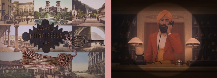 Розовый красный, охровый и фиолетовый — фирменные оттенки отеля, одежды персонала и ключевых интерьеров эпохи 1930-х. Это цвета сказочной роскоши, уюта, теплоты и эскапизма. Красный цвет — символ статуса, власти и театральности; розовый — иллюзия беззаботности, «фильтр памяти» Зеро