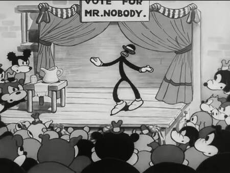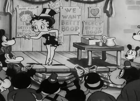 Также в анимации межвоенного периода нередко встречается политическая сатира, высмеивающая как отдельных государственных деятелей, так и избитые лозунги, предвыборную риторику и механизмы политической кампании. Характерным примером является серия «Betty Boop for President», где сюжет строится вокруг пародии на избирательный процесс: Бетти высмеивает популистские обещания, абсурдные программы «улучшения жизни» и театральность политических выступлений, превращая все окружающее в музыкально-комический фарс.
