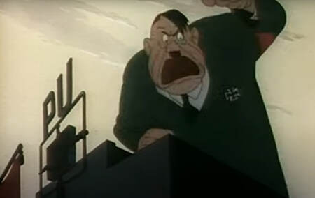 В пропагандистской анимации Второй мировой войны одним из ключевых инструментов становилось комическое унижение и дегероизация врага. Через гротеск, гиперболу и намеренно примитивные карикатурные черты противник представал как глупец, трус или нелепый фанатик, неспособный на рациональные действия. Такой приём лишал персонажа человеческой сложности и эмоциональной глубины, тем самым снижая возможность зрительского сопереживания. Подобная стратегия отчётливо проявляется, например, в Der Fuehrer’s Face или Russian Rhapsody, где лидеры стран «оси» превращаются в гротескные маски, служащие не столько объектом страха, сколько источником насмешки, что позволяло пропаганде воздействовать на аудиторию через смех и унижение противника.