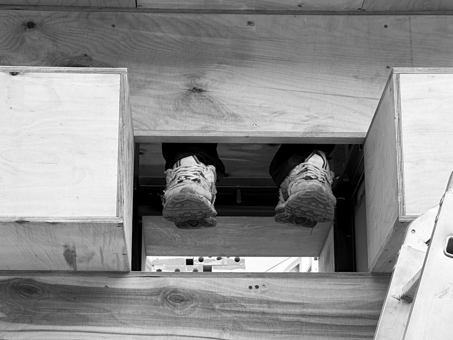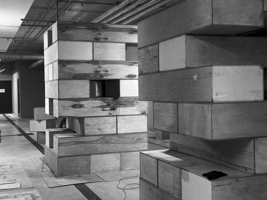 Каждый блок надежно крепится к каркасу, создавая визуальную и структурную целостность арт-объекта. Металлический каркас служит основой для каждого уровня, фиксируя фанерные элементы в нужном положении.