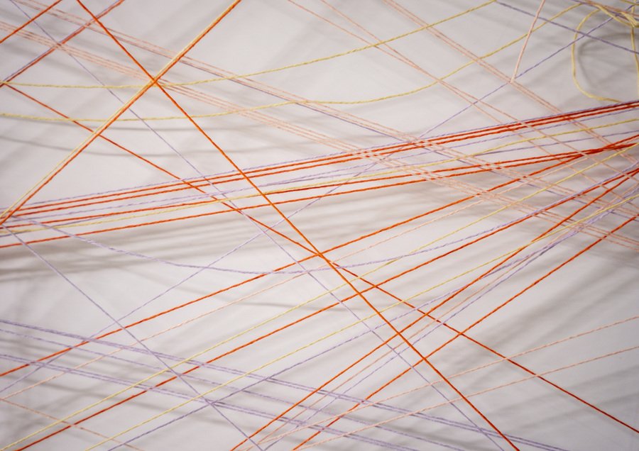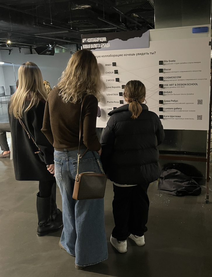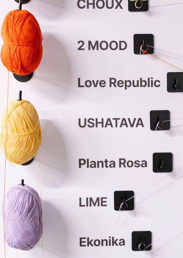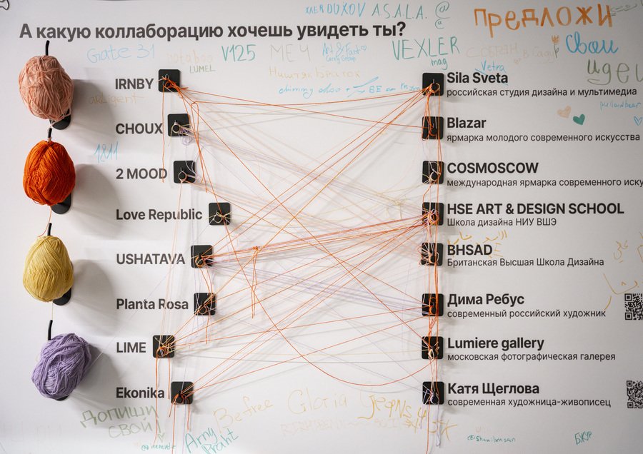 Текст из нашей экспликации: «Через интерактивный стенд мы предлагаем вам самим стать творцами и сплести из ярких нитей самые перспективные, на ваш взгляд, союзы между брендами и художниками. Возьмите нить и проложите путь — какую коллаборацию вы бы хотели увидеть? Какого бренда с каким художником? Тем самым вы поможете завершить наше исследование, а результаты мы отправим представленным брендам. Возможно, они по-новому посмотрят на развитие арт-коллабораций, а вы станете участником истории бренда!»