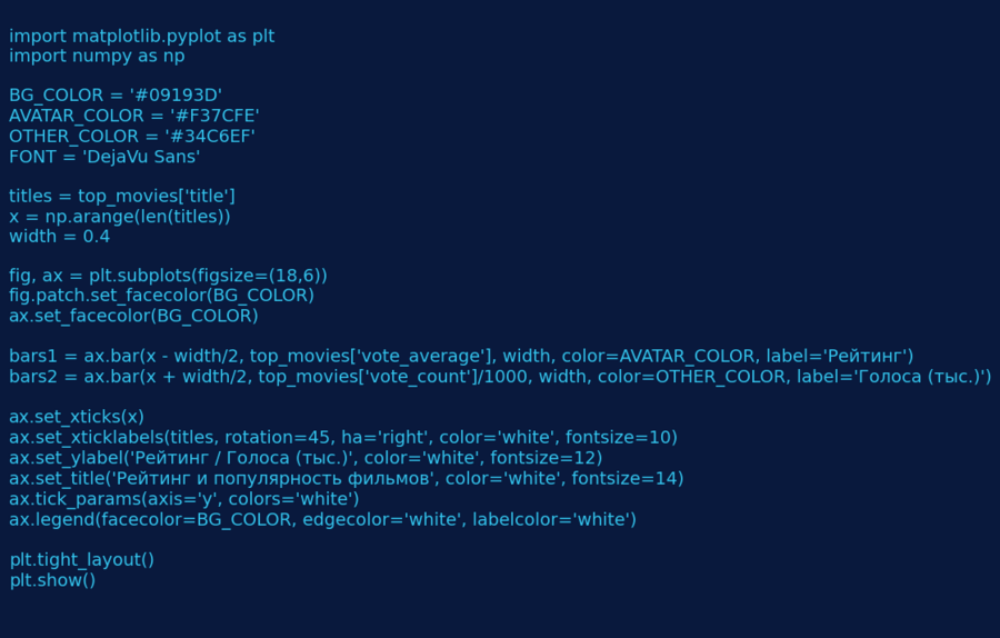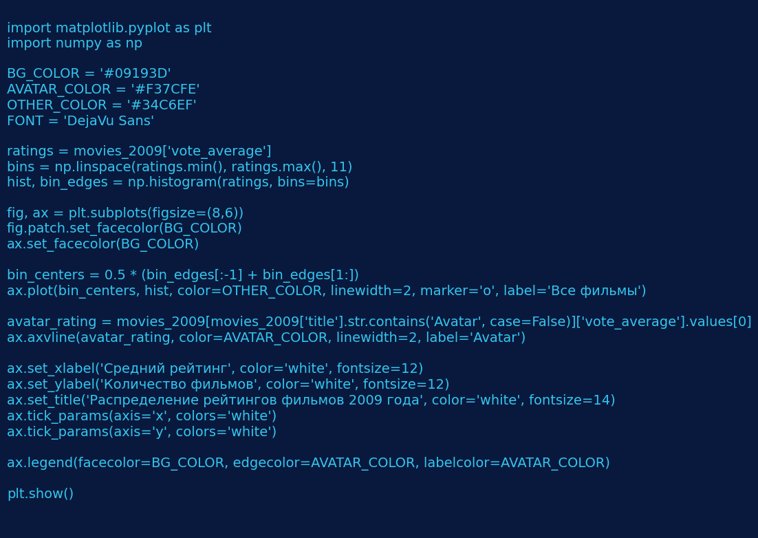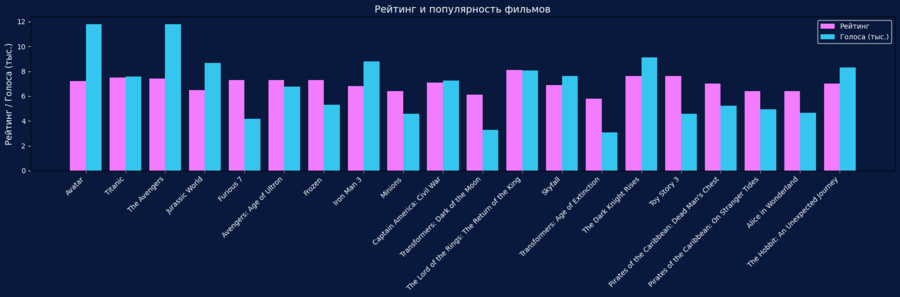 видно, что «Аватар» имеет высокий рейтинг, сопоставимый с другими культовыми фильмами. При этом количество голосов у него одно из самых высоких, что говорит о большом числе зрителей. Можно заметить, что высокий рейтинг не всегда означает максимальное количество голосов — популярность и качество не всегда совпадают.
