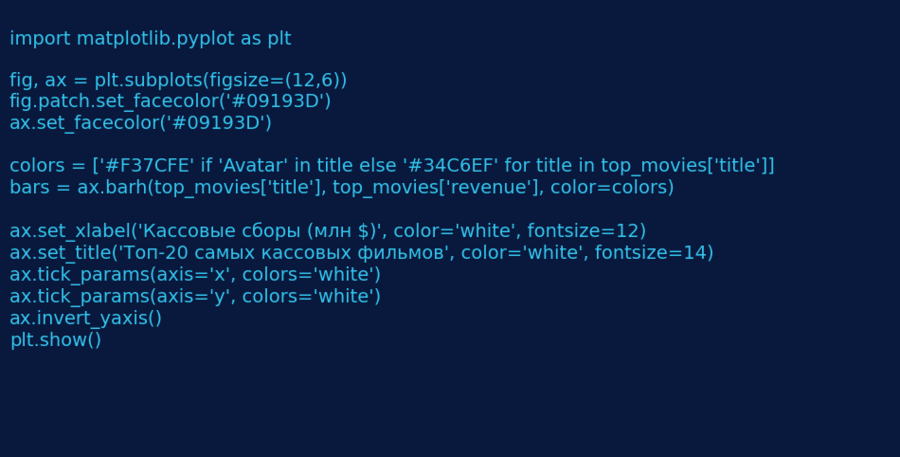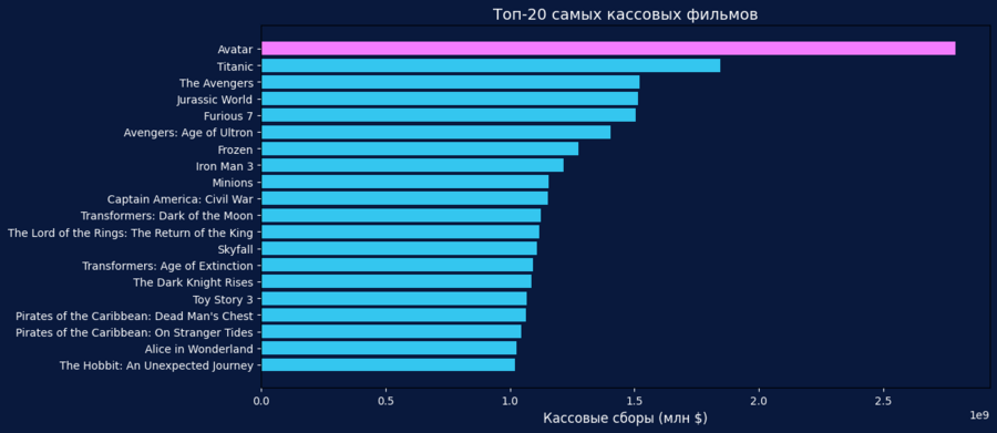 После я решила проверить кассовые сборы фильма. Если фильм настолько популярен и высоко оценён, значит, он должен быть успешен и финансово. Для этого я построила график кассовых сборов топ-20 самых кассовых фильмов.