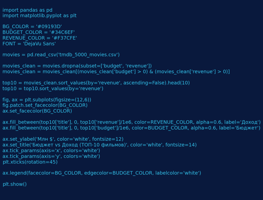 Заключительным этапом исследования стал анализ соотношения бюджетов и доходов фильмов. Этот график позволяет оценить эффективность вложенных средств.