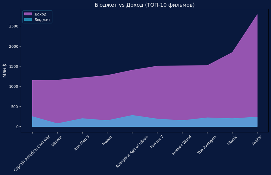На визуализации отчётливо видно, что «Аватар» занимает лидирующее положение и по этому показателю. При высоком бюджете фильм принёс несоизмеримо большие доходы. Разрыв между затратами и прибылью значительно превышает показатели других фильмов.