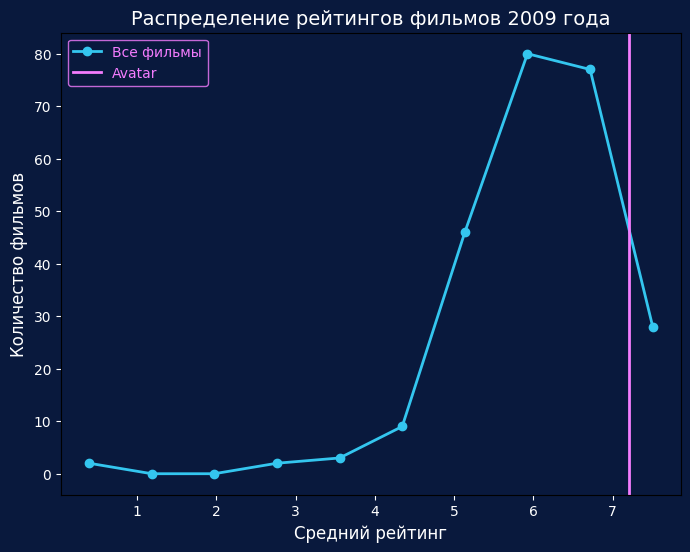 Основная масса фильмов сосредоточена в диапазоне средних рейтингов. «Аватар» находится выше среднего значения и уверенно относится к числу наиболее высоко оценённых работ года.