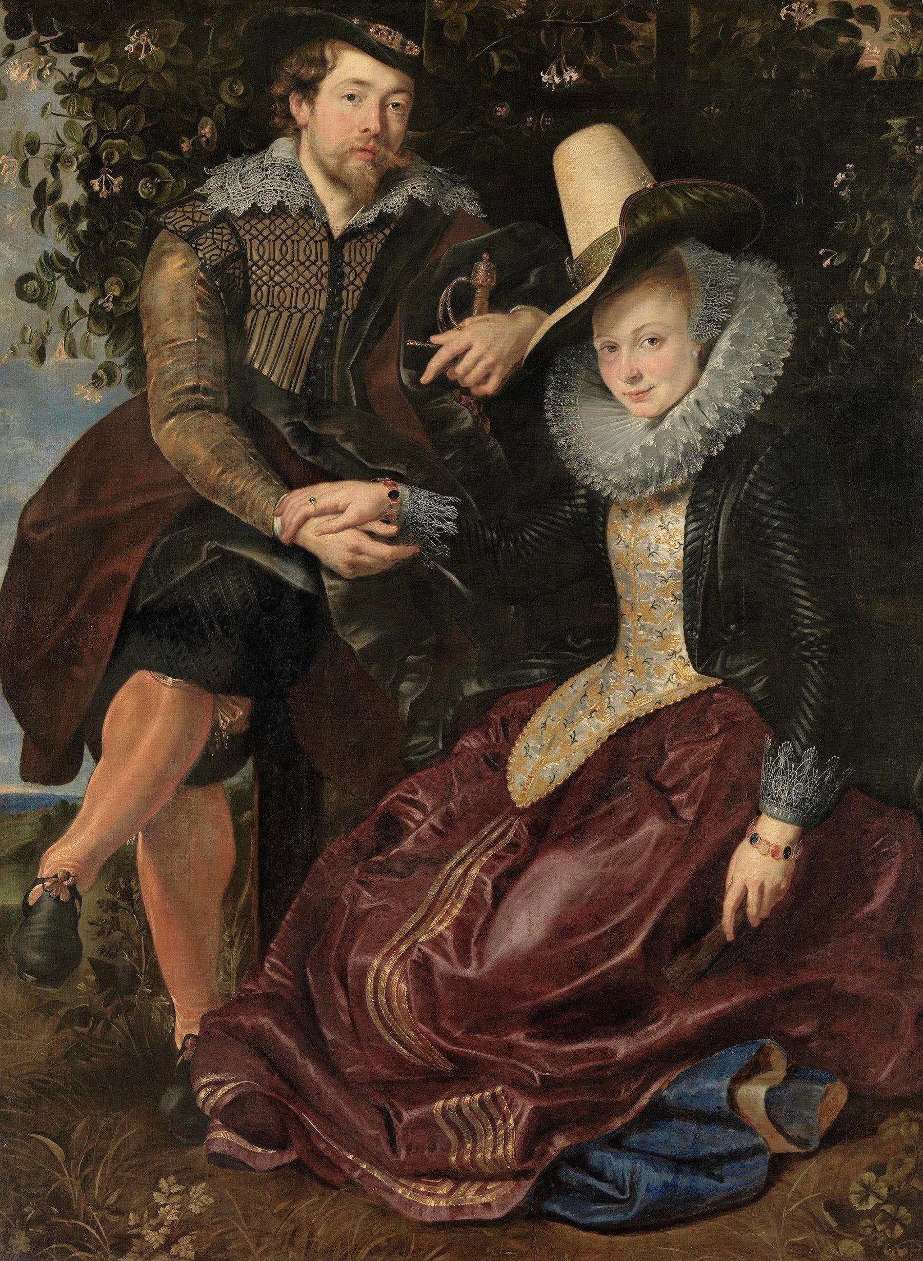 Питер Пауль Рубенс — нидерландский живописец, один из основоположников барокко, коллекционер и дипломат. Автопортрет с женой Изабеллой Брант, дочери антверпенского гуманиста, посвящен теме супружеской верности и, вероятно, адресован отцу Изабеллы в качестве подарка. Картина сочетает в себе элементы свадебного портрета, жанровой сцены и интеллектуальной аллегории. В отличие от формальных парных портретов того времени, здесь чувствуется теплота и равноправие.