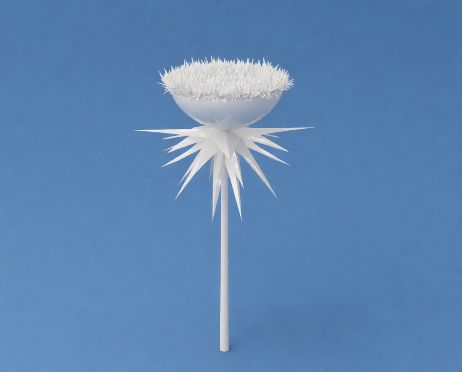 · Материал: Мономатериал — высококачественная белая фаянсовая масса для тонкого фарфора или дисперсно-упрочнённая керамика (DCP). · Цвет: Цельносделанное, однородно белое. Допускаются только естественные вариации тона от света и тени после глазурования. · Финишная обработка: Матовая или полуматовкая (сатиновая) глазурь. Поверхность должна быть идеально гладкой, тактильно приятной, без пор и дефектов. · Крепление: В основании должно быть предусмотрено скрытое крепление или утяжеленная платформа для устойчивости.