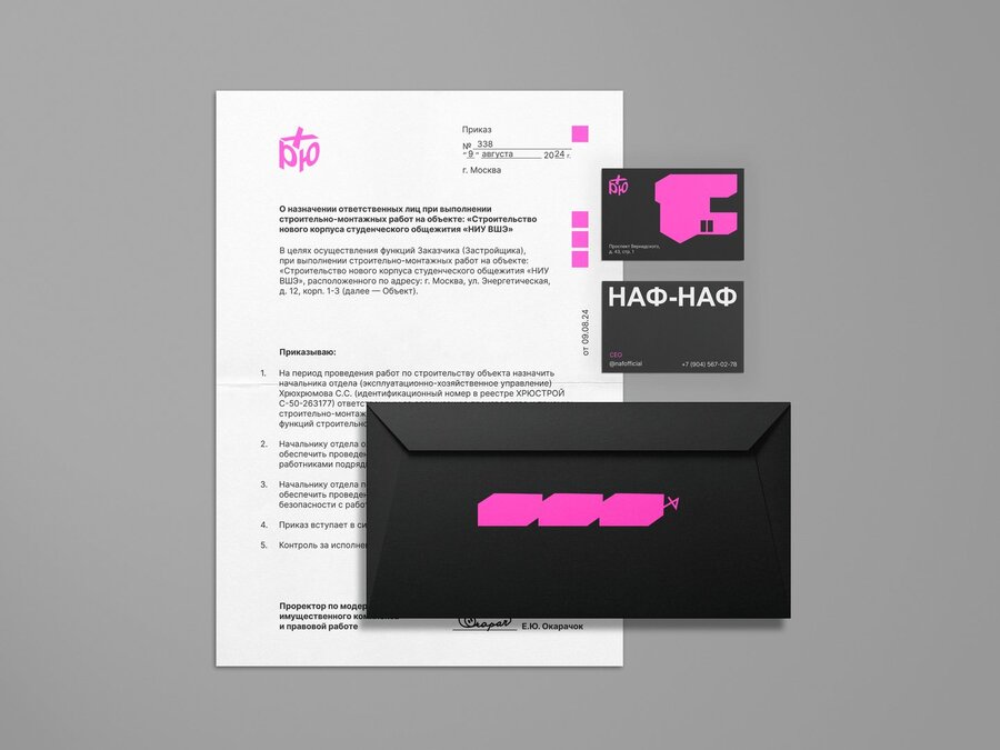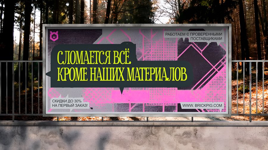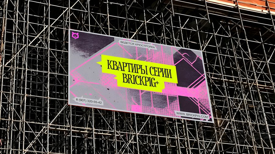 Основой фирменного стиля BRICKPIG является сгенерированный динамичный сетчатый узор, слоистая текстура с шумом, напоминающая шероховатую поверхность арматуры и бетона. Яркие цвета (фуксия, желтый) в сочетании с вымеренной геометричностью и «живой» тактильной фактурой подчеркивает технологичность и в то же время смелость строительного бренда.