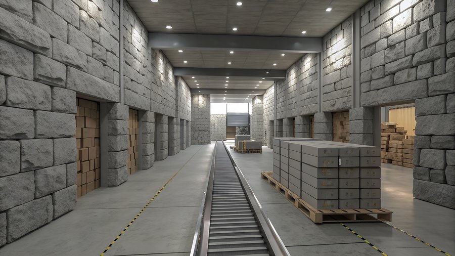 Recraft (отдел по камнеукреплению): modern industrial warehouse interior with stone brick walls, concrete floor and metal ceiling beams, central conveyor belt leading into distance, stacked pallets and boxes along the sides, soft artificial lighting with ceiling spotlights, realistic materials and shadows, clean architectural composition, cinematic realism