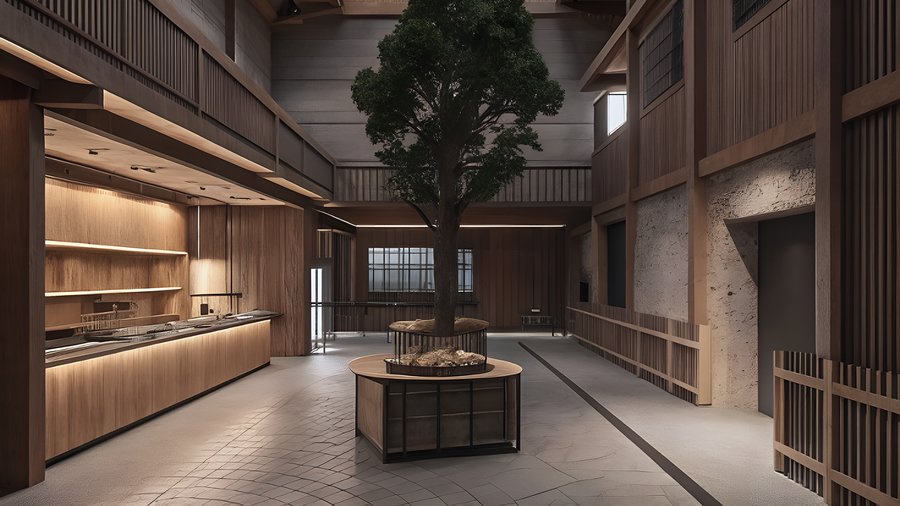 Recraft (отдел по прутоплетению): an image of a large wooden space with wooden houses built into the walls, beams in the middle, light, a fence around it, a huge tree, a stone floor, studio light, and a hyperrealistic image