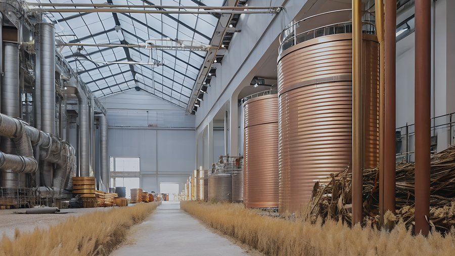 Recraft (отдел по соломосушению): realistic industrial interior with large metallic tanks and ventilation pipes, high glass ceiling with natural daylight, modern architecture, clean symmetrical composition, warm copper and steel tones, dry grass along the pathway, detailed materials and textures, cinematic lighting
