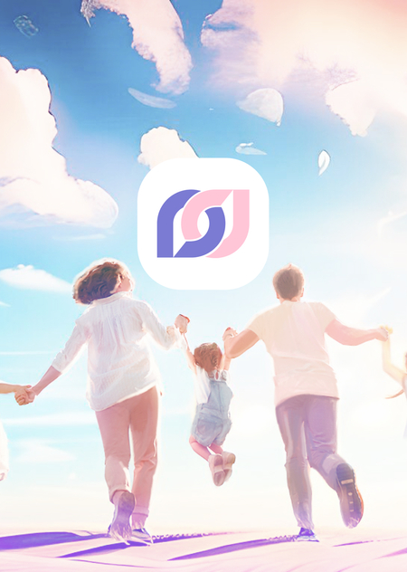 Generate a picture of a happy family. mom, dad and 3 children. They are running into the distance. We can see their backs. Beautiful endless sky. They are dressed in simple clothes. The style is a realistic illustration. Light shades. Pink and purple shades.