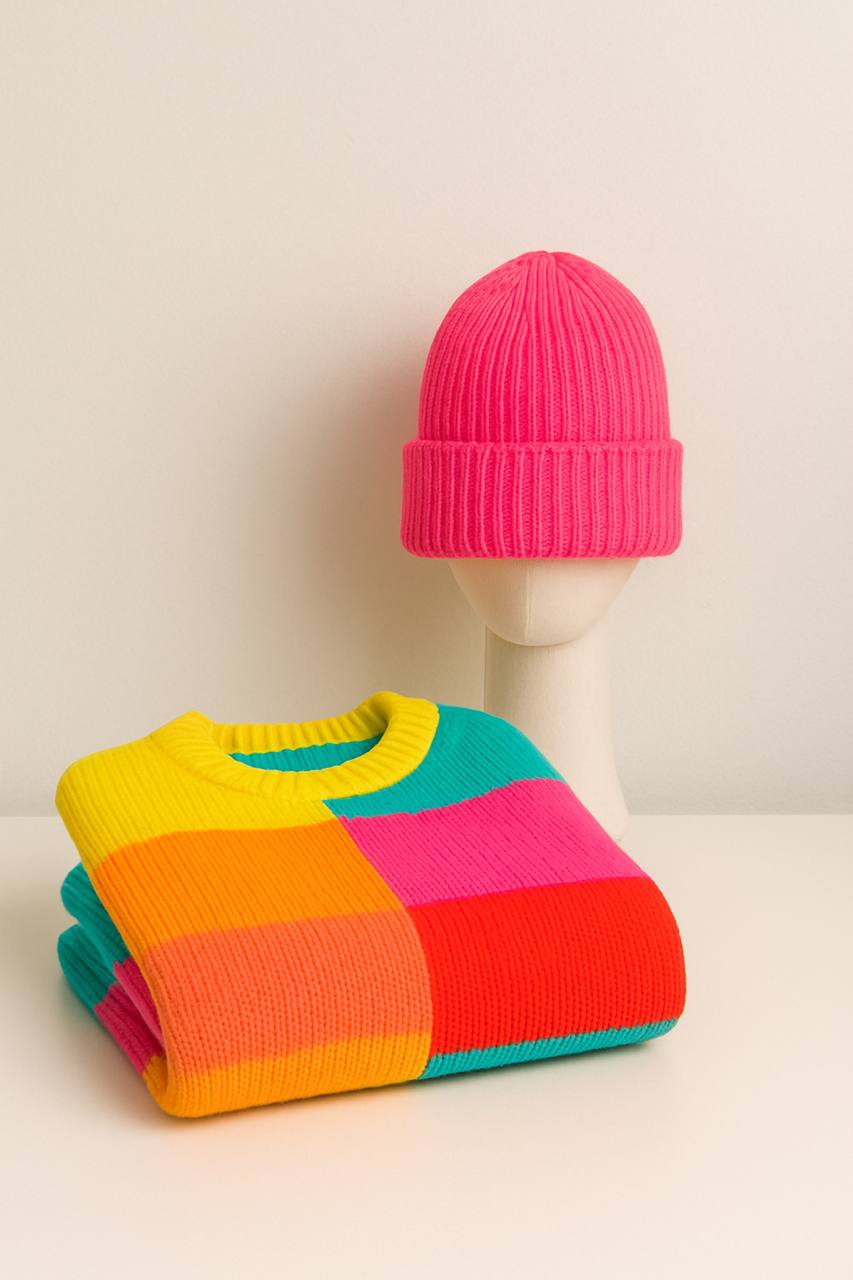 — «A folded multicolored knitted sweater with bold blocks of yellow, orange, pink, red, and turquoise, placed on a light beige surface. Next to it stands a minimalist mannequin head wearing a bright neon pink ribbed beanie. Soft natural lighting, neutral background, editorial-style fashion product photo, no text, clean composition».