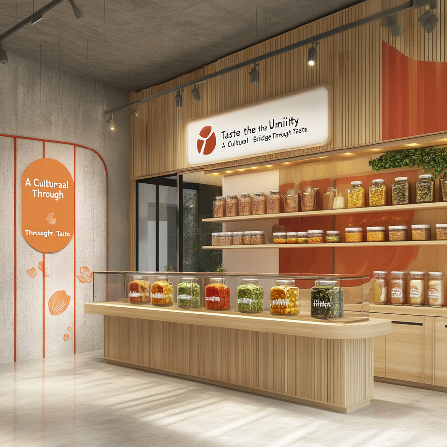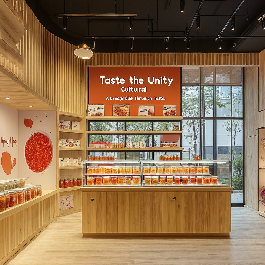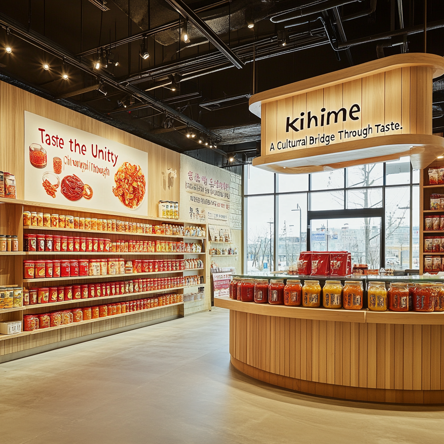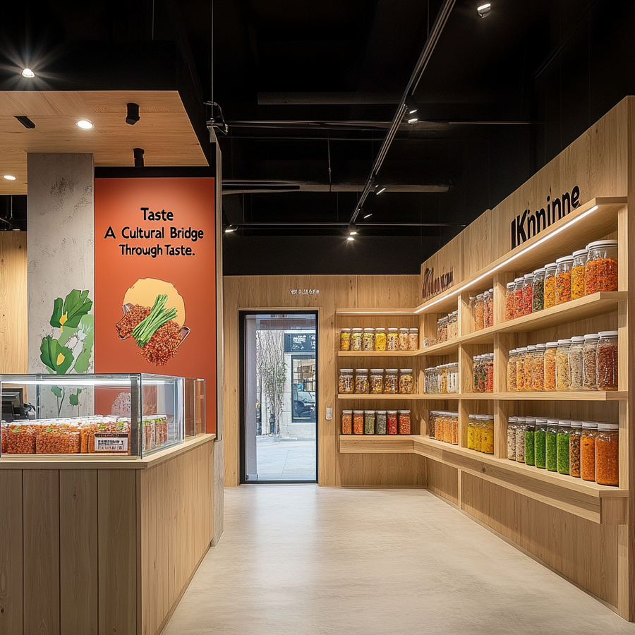 Design an interior for the Kimchine Kimchi Store, where customers can experience the culture and authenticity of kimchi, while highlighting the fusion of tradition and modernity. The space should feel warm, inviting, and connected to both Korean heritage and contemporary design elements, reflecting the brand’s values of cultural unity and sustainability.